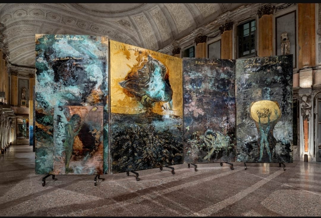 Come sottolinea Natacha Fabbri nel suo contributo presente in catalogo, «l’allestimento frammenta e moltiplica le donne di questi teleri in un caleidoscopio di immagini che si ricompongono in modalità sempre diverse, che generano meraviglia attraverso il gioco di riflessione creato dagli specchi della Sala delle Cariatidi e dalle imponenti tele. […] In questo spazio scisso e solenne, il visitatore non è più spettatore, ma si trova immerso nel processo trasmutatorio: riflesso, frammento, eco di una trasformazione che lo travolge. La memoria di queste donne si fa materia viva, si incarna nei colori dell’alchimia […] in un movimento continuo tra combustione e sublimazione, sterilità e fecondità. Qui la donna non è figura passiva né mera esecutrice di un’antica arte: è il principio ardente della trasformazione, fuoco ella stessa che consuma e ricrea, soggetto e oggetto di una natura che lei plasma e da cui si lascia plasmare, natura e artificio, materia e mente, che congiunge terra e cielo.» Attraverso una pittura materica e fortemente simbolica, l’artista rende visibile ciò che è stato sepolto: corpi e volti femminili emergono dalle macerie come presenze potenti e perturbanti, lontane da ogni idealizzazione. Le opere stesse si configurano come veri e propri laboratori alchemici, in cui piombo, zolfo, ossidi, oro, fiori e cenere compiono la loro trasformazione, sottoposte alla violenza della fiamma ossidrica, cosparse da una materia corposa a tinte plumbee, da dove affiorano via via i corpi e i volti delle alchimiste. In questo dialogo, la Sala delle Cariatidi — con le sue figure femminili mutilate dalla guerra — diviene uno spazio denso di significato, metafora e cornice attuali di una narrazione che riporta alla luce donne finalmente riconosciute.