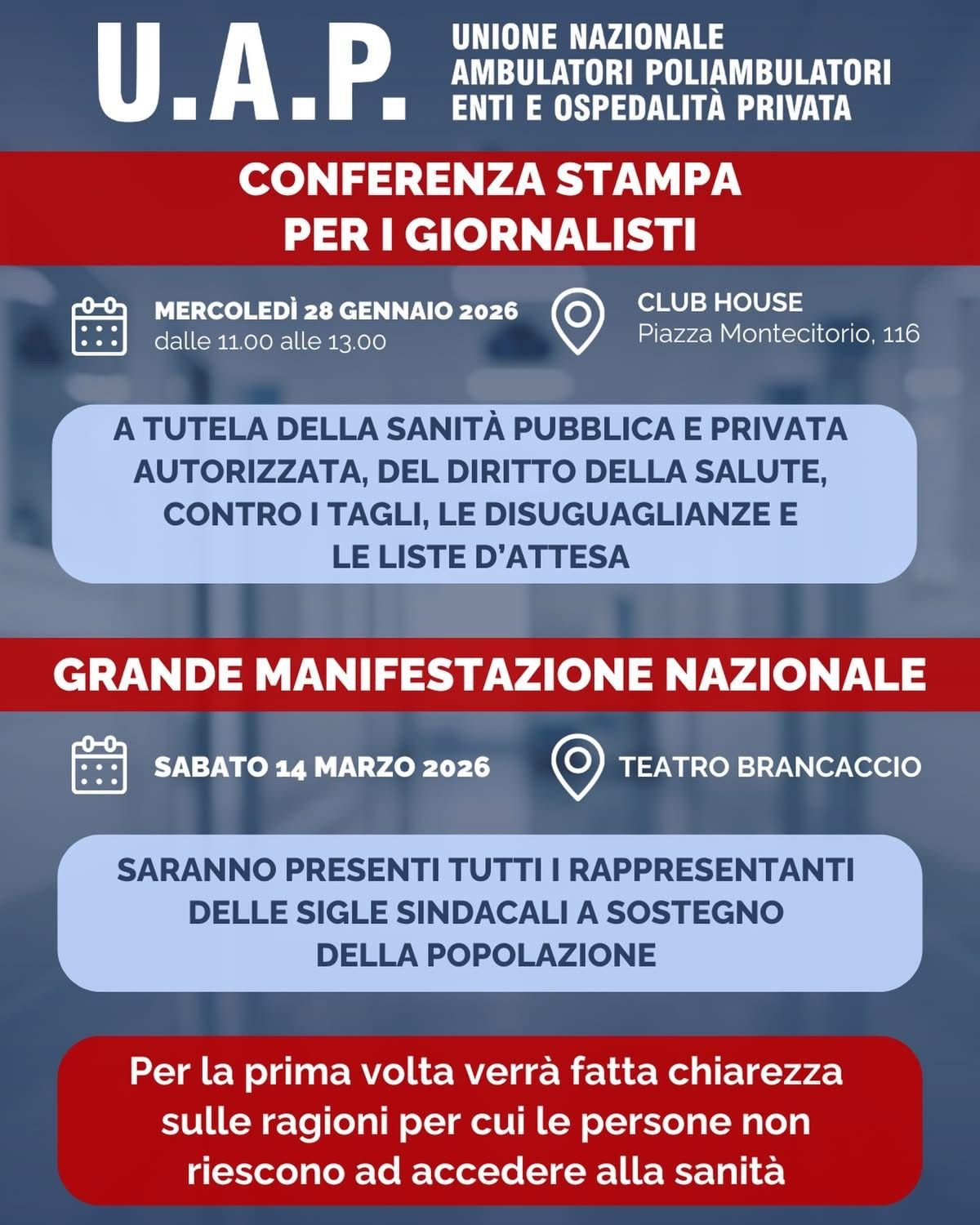 ROMA 28 GENN 2026 – Difendere il Servizio Sanitario Nazionale significa difendere i cittadini, il diritto alla salute e la qualità delle cure. È questo il messaggio emerso con forza nel corso della conferenza stampa promossa nella giornata odierna dall’Unione Nazionale Ambulatori e Poliambulatori (UAP), durante la quale è stata annunciata una manifestazione nazionale che si terrà il 14 marzo a Roma.