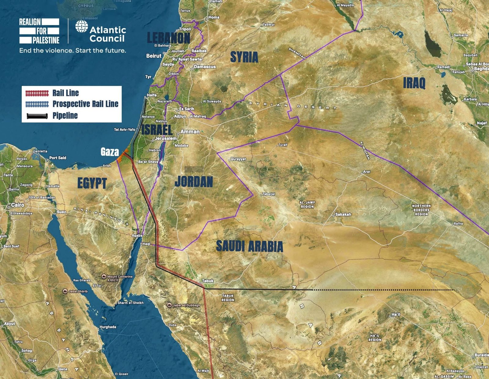 Una linea ferroviaria Gaza–Giordania–Golfo, integrata con le reti saudite ed emiratine.