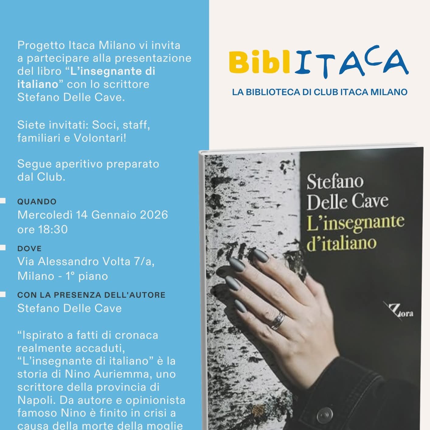 L’insegnante d’italiano sbarca a Milano. Vi aspetto per incontrarci a Milano il 14 Gennaio presso la sede di Associazione Progetto Itaca Milano in un viaggio tra attualità e immaginazione sulle tracce di una storia ispirata a fatti reali di cronaca come la guerra in Ucraina. Vi aspetto qui e con tante novità