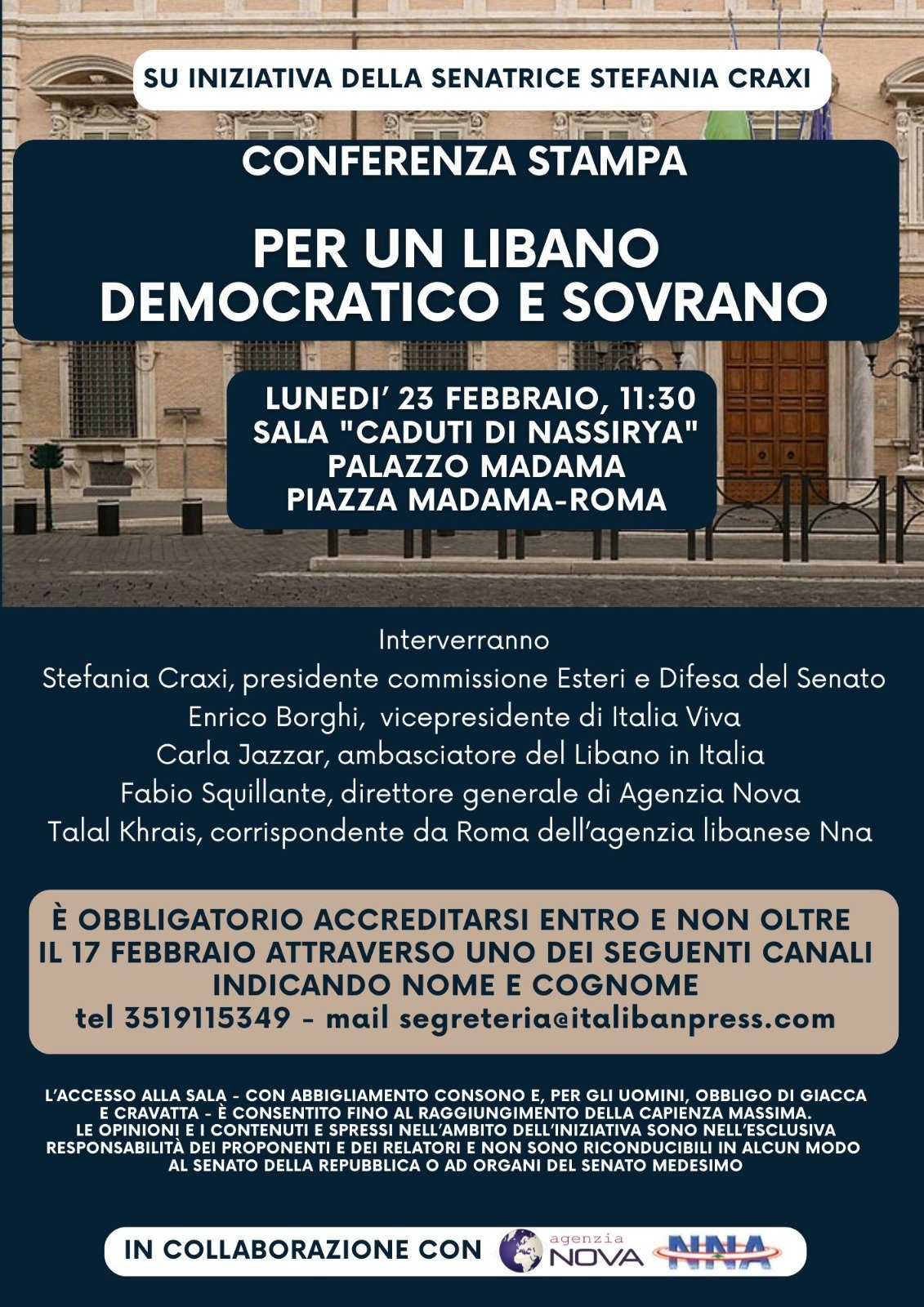 Tiani ha continuato: “Siamo pronti a esplorare altre soluzioni, che potrebbero includere una presenza italiana dopo il ritiro di UNIFIL, perché crediamo nella necessità di rafforzare la presenza dell’esercito libanese come garanzia di stabilità. Crediamo che il Presidente Aoun sia la persona giusta per garantire stabilità ed equilibrio in quella delicata regione del Medio Oriente. Pertanto, continueremo a sostenerlo, anche attraverso la nostra presenza militare, nell’addestramento dell’esercito libanese, che a sua volta disarmerà Hezbollah. Rafforzare l’esercito libanese è garanzia di stabilità”. Da parte sua, Stefania Craxi, Presidente della Commissione Relazioni Internazionali del Senato italiano, in collaborazione con l’agenzia di stampa Nova e l’Agenzia Nazionale di Stampa di Roma, ha convocato una conferenza stampa per il 23 febbraio con l’Italia per il Libano. Alla conferenza parteciperanno l’Ambasciatrice libanese in Italia, Carla Jazzar, e diversi membri delle Commissioni Relazioni Internazionali e Difesa di diversi partiti politici italiani. Parteciperà anche Talal Khreis, corrispondente dell’Agenzia Nazionale di Stampa a Roma e presso la Santa Sede. Sarà presente anche Fabio Squillanti, Direttore dell’agenzia di stampa Nova.