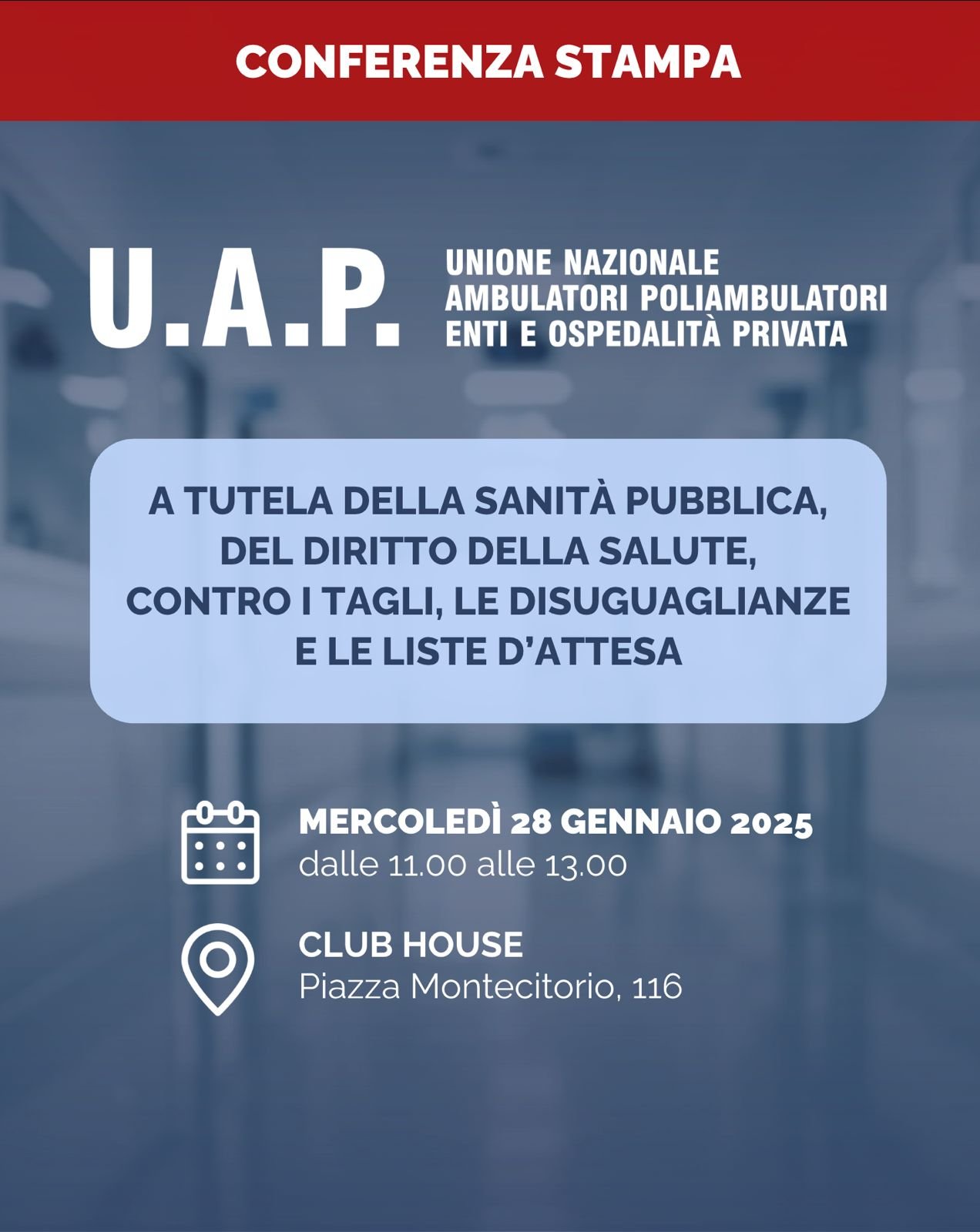 Roma, 15 gen. (LaPresse) – Il 28 gennaio 2026 UAP – Unione Nazionale Ambulatori e Poliambulatori – terrà a Roma, alle ore 11, presso la Club House di Piazza di Monte Citorio 116, una conferenza stampa per “richiamare l’attenzione dell’opinione pubblica e dei media su alcune criticità strutturali del sistema sanitario, che stanno producendo effetti concreti sull’accesso alle cure, sulla sicurezza dei pazienti e sulla qualità delle prestazioni”, si legge in un comunicato.